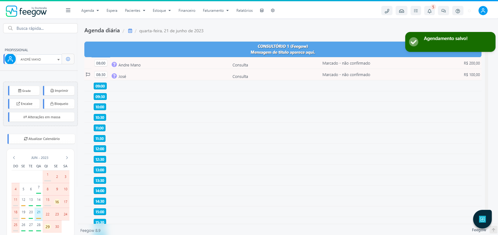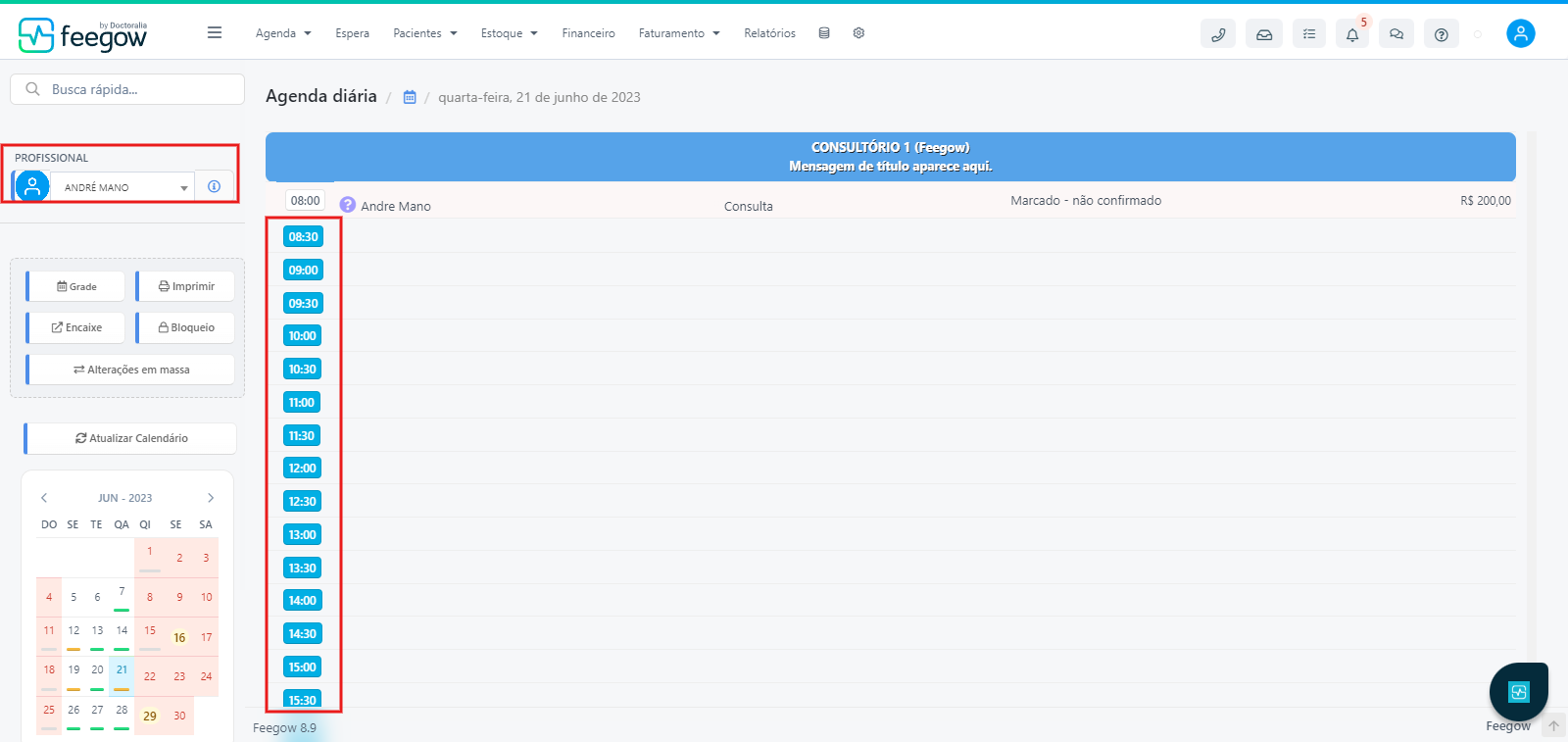Agora que o profissional cadastrado já possui uma grade com seus horários de atendimento configurados, podemos realizar o primeiro agendamento de um paciente. Veja a seguir como realizar os agendamentos no Feegow.