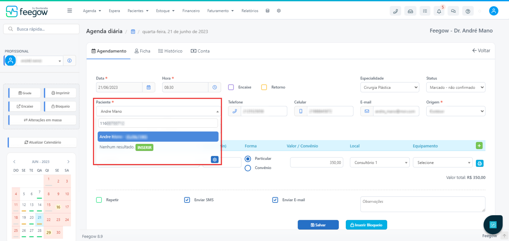 As informações do tempo de duração, valor e equipamento utilizado do procedimento cadastrados em "Cadastros de Procedimentos" aparecerão automaticamente. Caso a licença utilize as confirmações por E-mail ou SMS, as caixinhas estarão marcadas por padrão. Clique em salvar. O usuário será direcionado novamente para a agenda, e o aviso de "Agendamento Salvo" aparecerá.