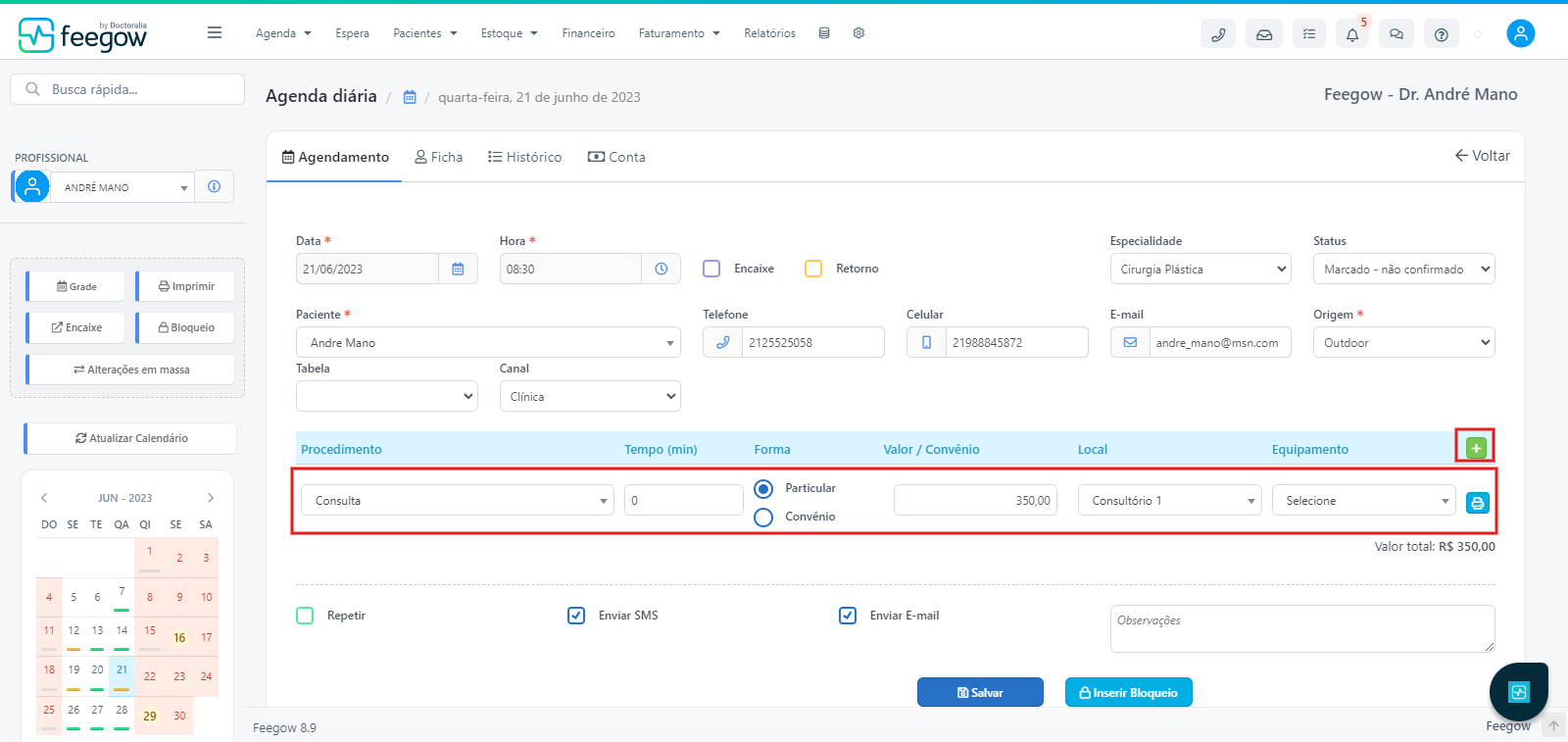 Após selecionar o paciente (ou inserindo um novo), selecione o procedimento que está agendando. Informe se o agendamento é no particular ou convênio. É possível inserir outros procedimentos clicando no botão verde "+".