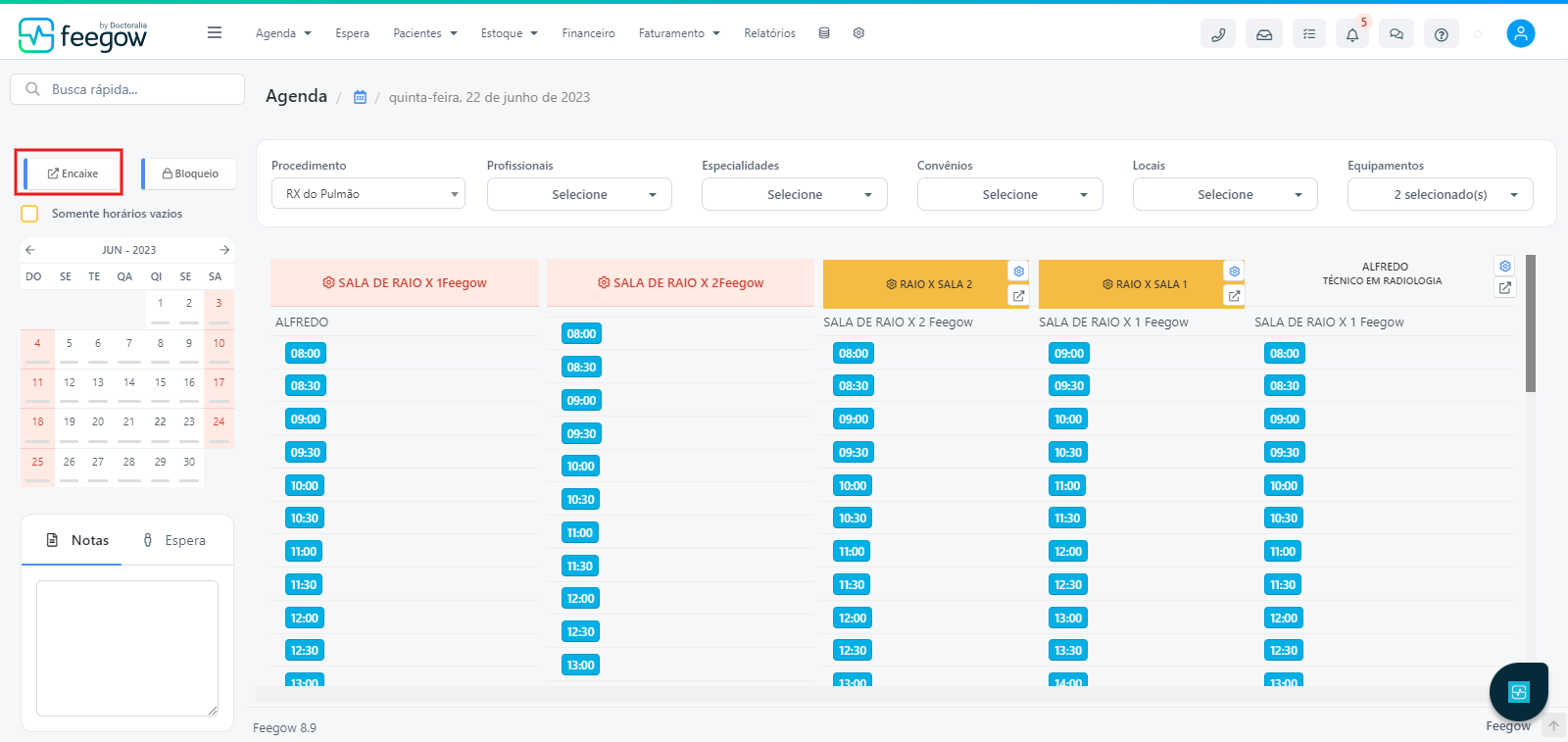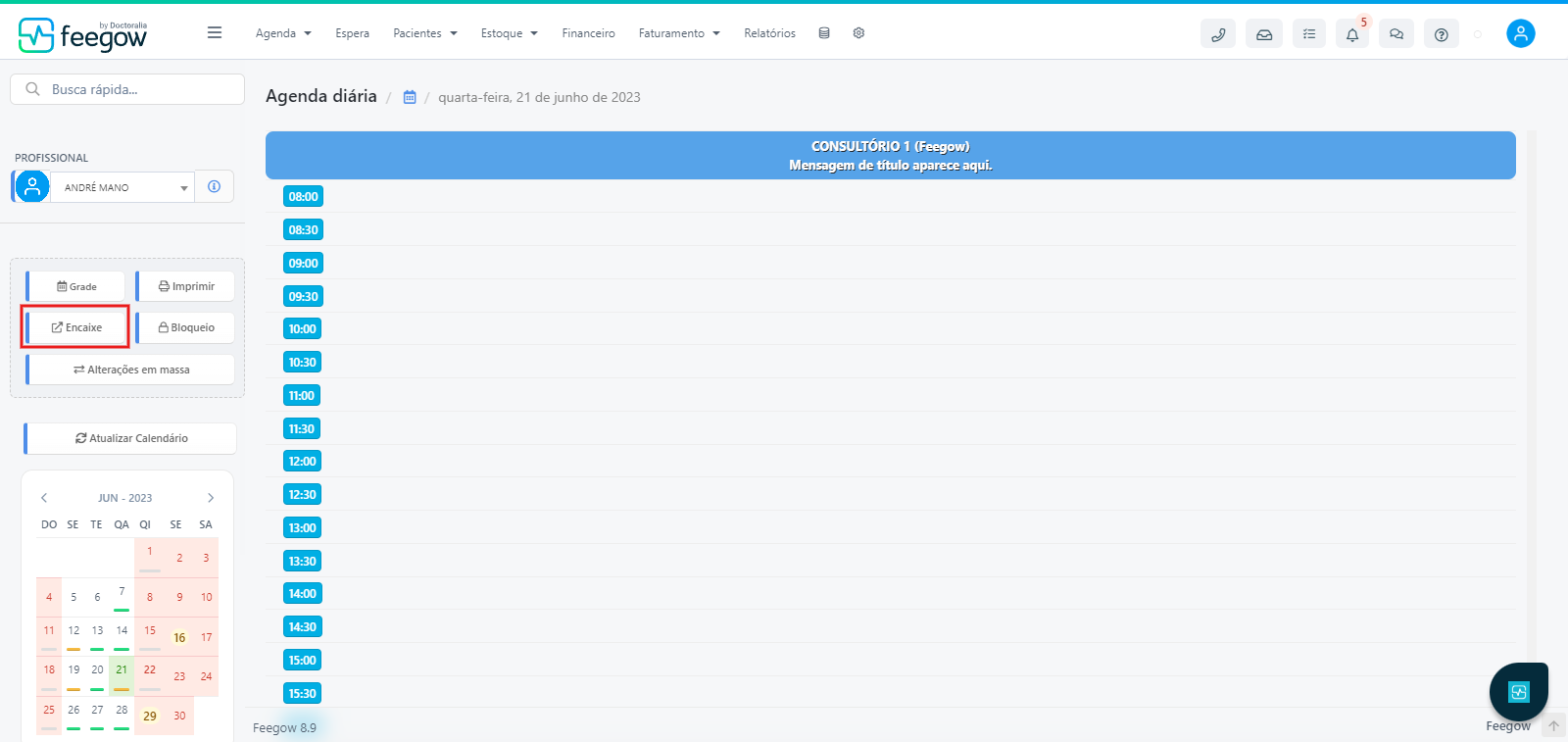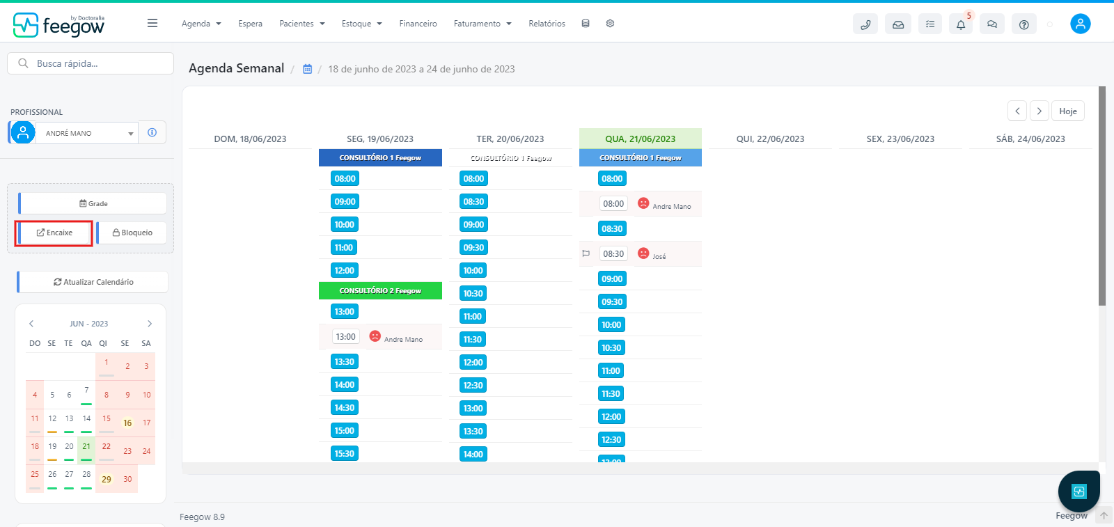 Para realizar um agendamento por encaixe, acesse a agenda do profissional, selecione a data desejada clicando no calendário e em seguida clique em "Encaixe".
