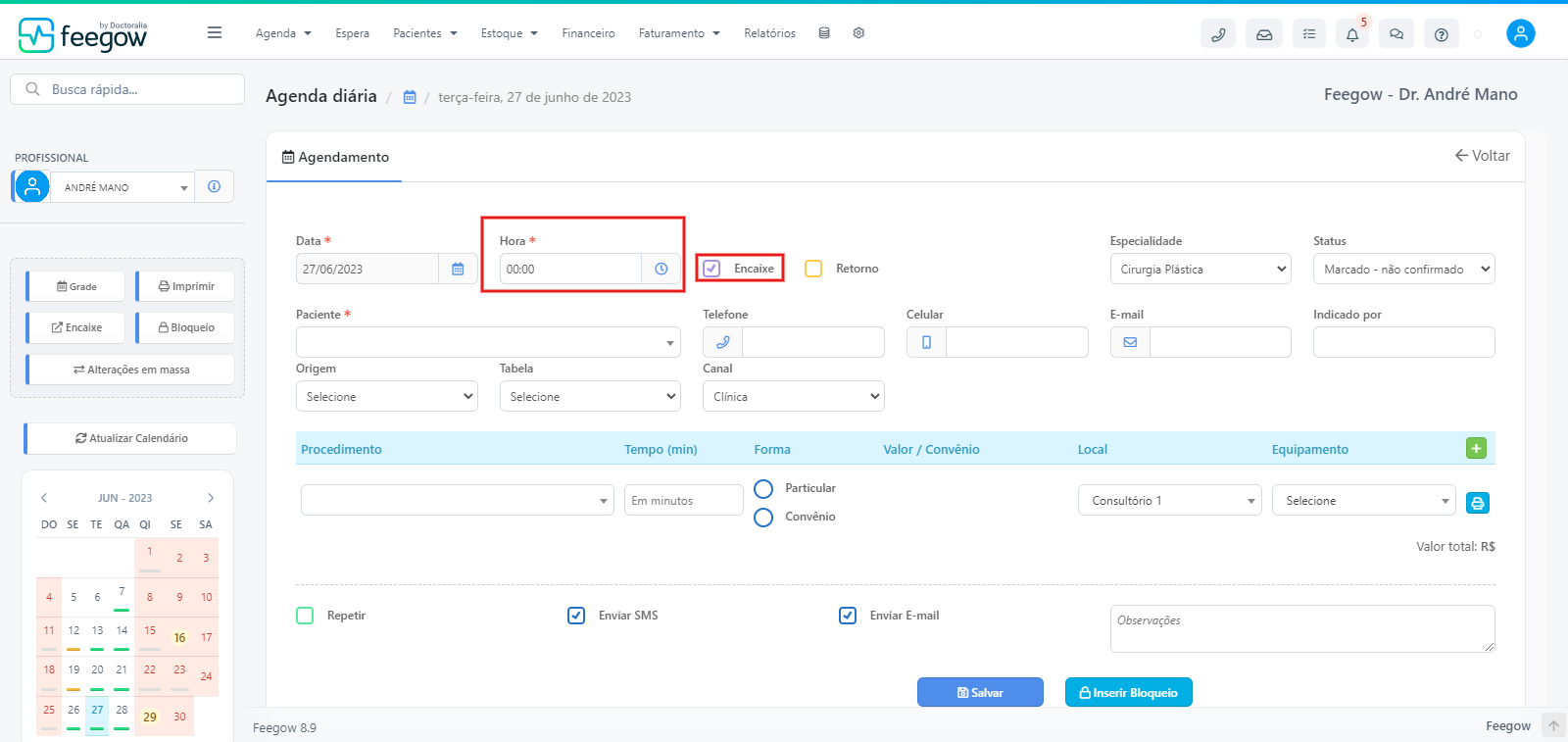 Em seguida, será aberta uma tela parecida com a tela do agendamento normal. As únicas diferenças são: a caixinha "encaixe" ficará marcada e será necessário preencher o horário do agendamento.