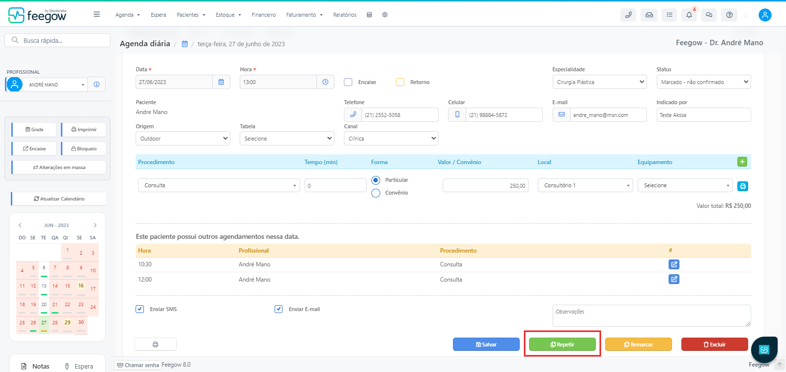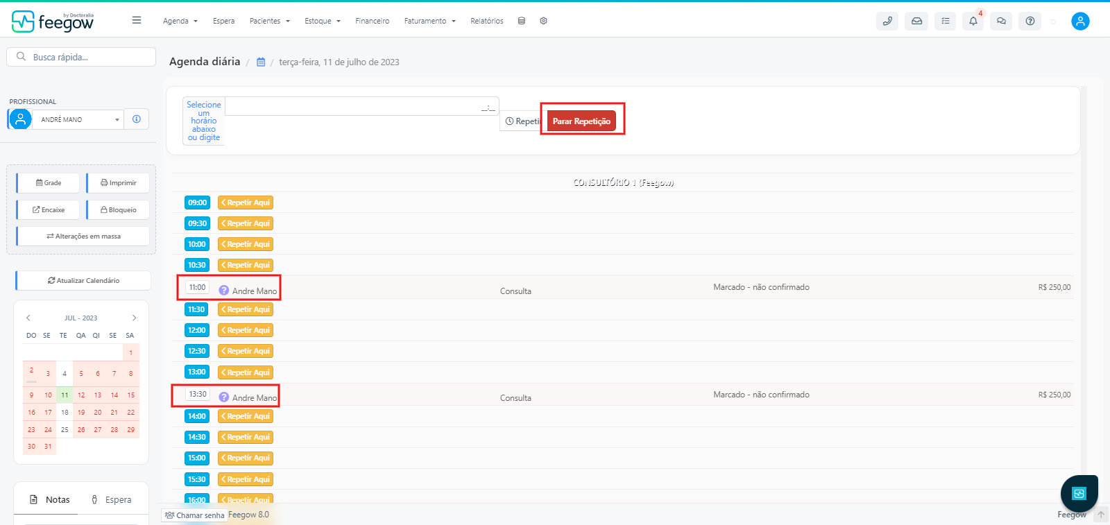 Se por algum motivo precisar realizar um novo agendamento de um paciente igual a um agendamento que já existe, o Feegow tem a opção "Repetir".
