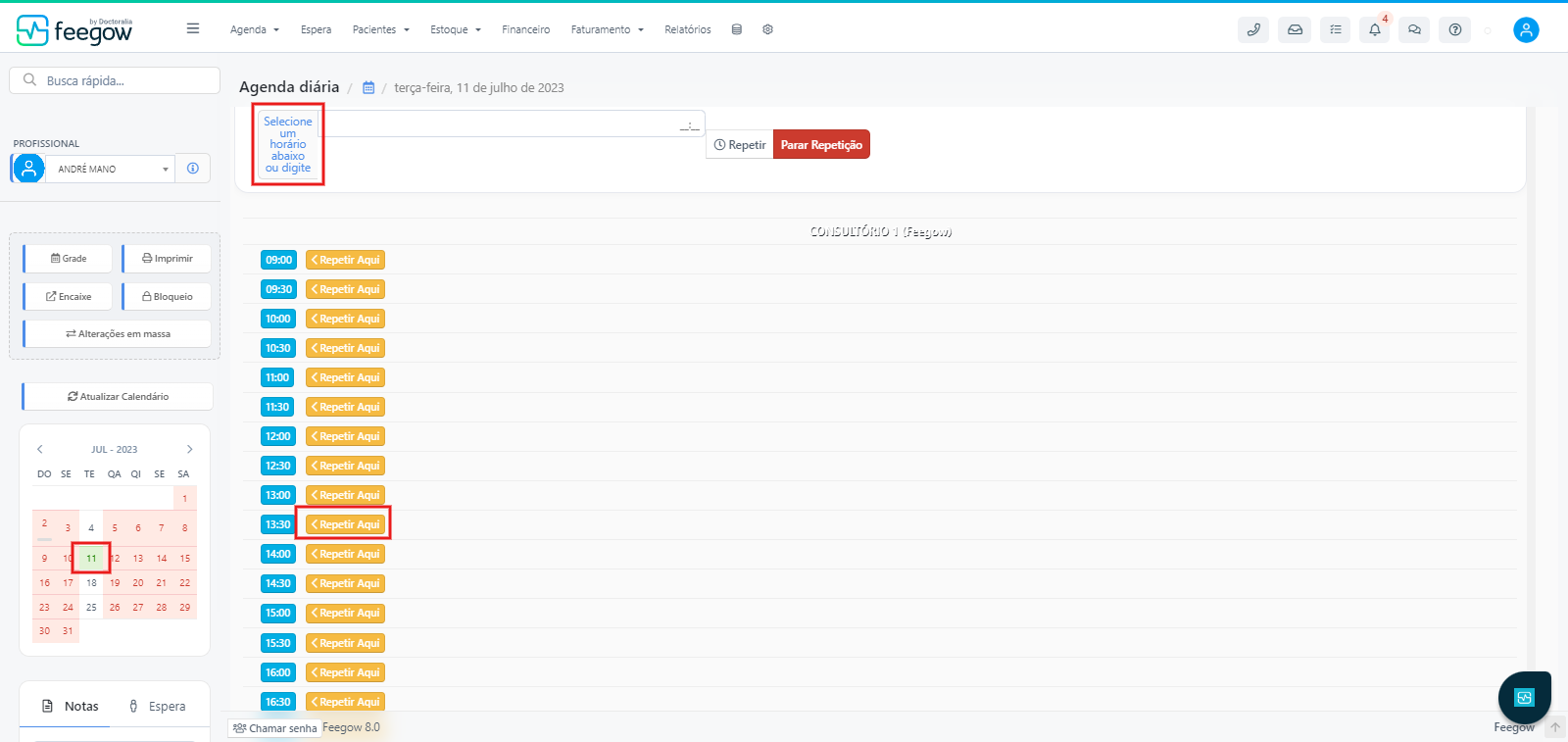 Em seguida, selecione a data que deseja repetir o agendamento e clique no horário desejado. Também é possível preencher manualmente o horário desejado.