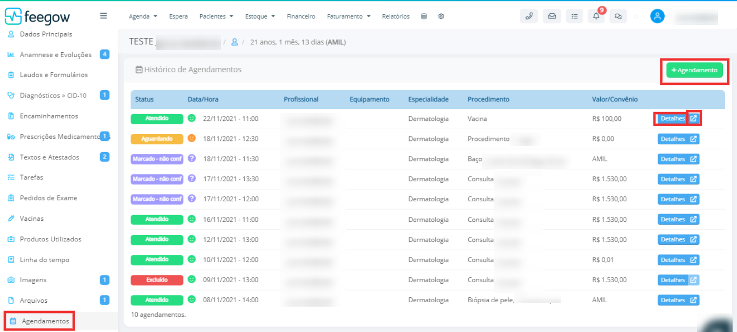 - Nesta tela, inclusive será possível realizar um novo agendamento, selecionando a opção de +Agendamento.
