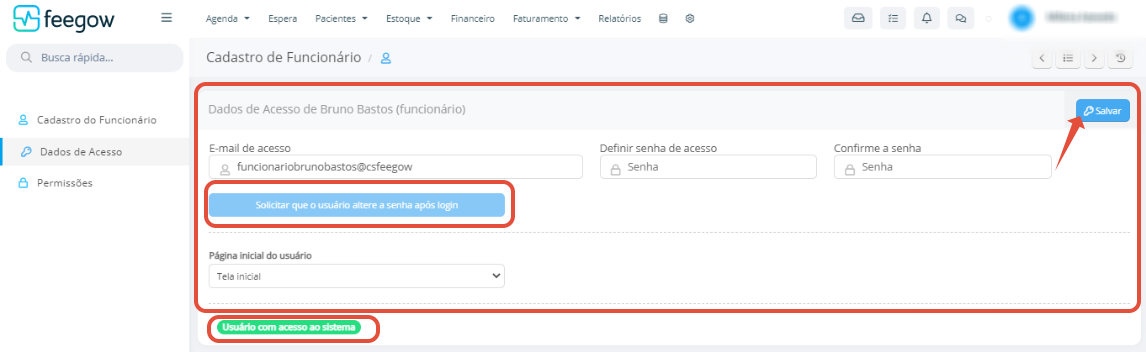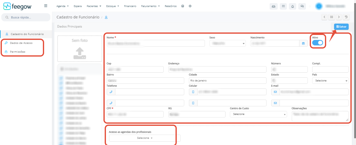 No cadastro de funcionários é feita a inclusão dos colaboradores da clínica. Assim, eles terão acesso ao sistema Feegow e poderão realizar suas funções diárias.