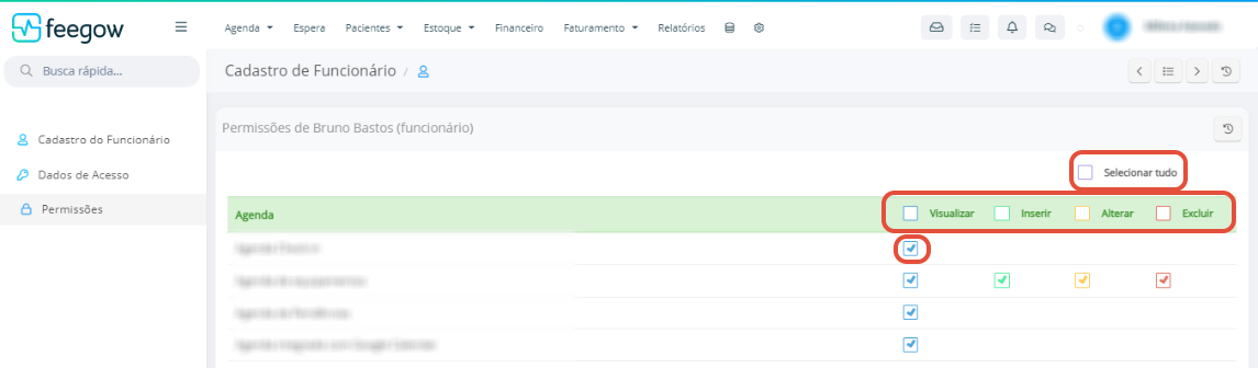 Se selecionar "profissionais" em "acesso às agendas", o funcionário poderá visualizar apenas as agendas dos profissionais selecionados. Salve.