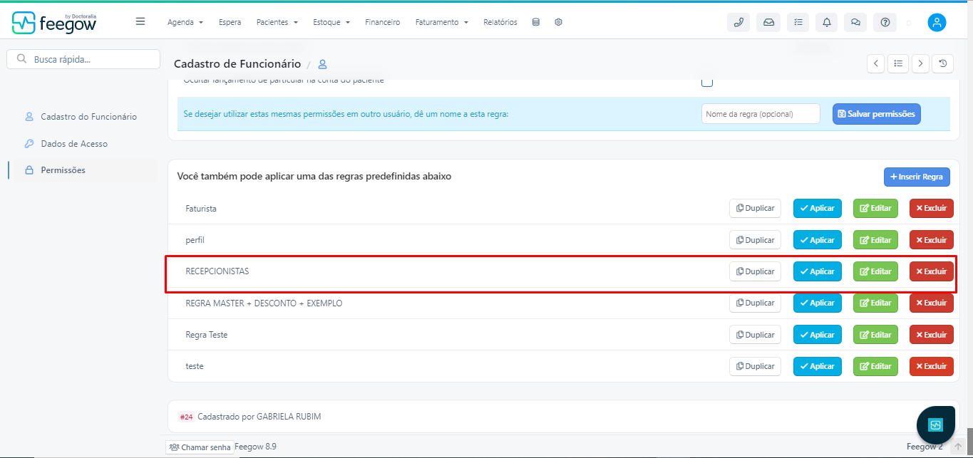 Você pode duplicar, aplicar, editar e excluir uma regra. A função "aplicar" é usada ao acessar o perfil do profissional e clicar em "aplicar". Isso garante que ele tenha essas permissões.