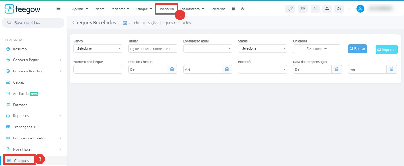 - O usuário ao possuir a permissão indicada acima, poderá ir no Financeiro, no menu superior, e selecionar a opção de Cheques, no menu esquerdo, conforme indicado na imagem abaixo.