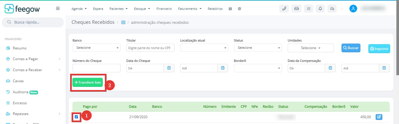 - O usuário deve selecionar o checkbox da linha do cheque desejado, e aparecerá a opção de Transferir.