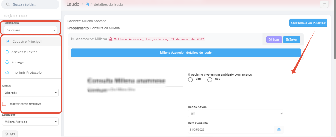Depois que já tiver inserido todas as informações, salve e altere o status para liberado. Feito isso, irá constar na Área do Paciente, onde o próprio paciente terá o acesso. Ou em cadastros > laudos para controle do profissional e clínica.