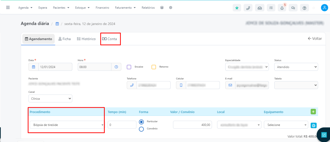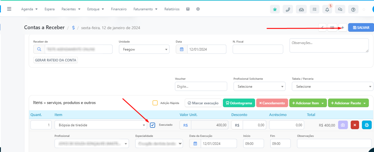 Para lançar e executar um procedimento basta selecionar o agendamento > conta > lançar (particular) > executado > salvar.