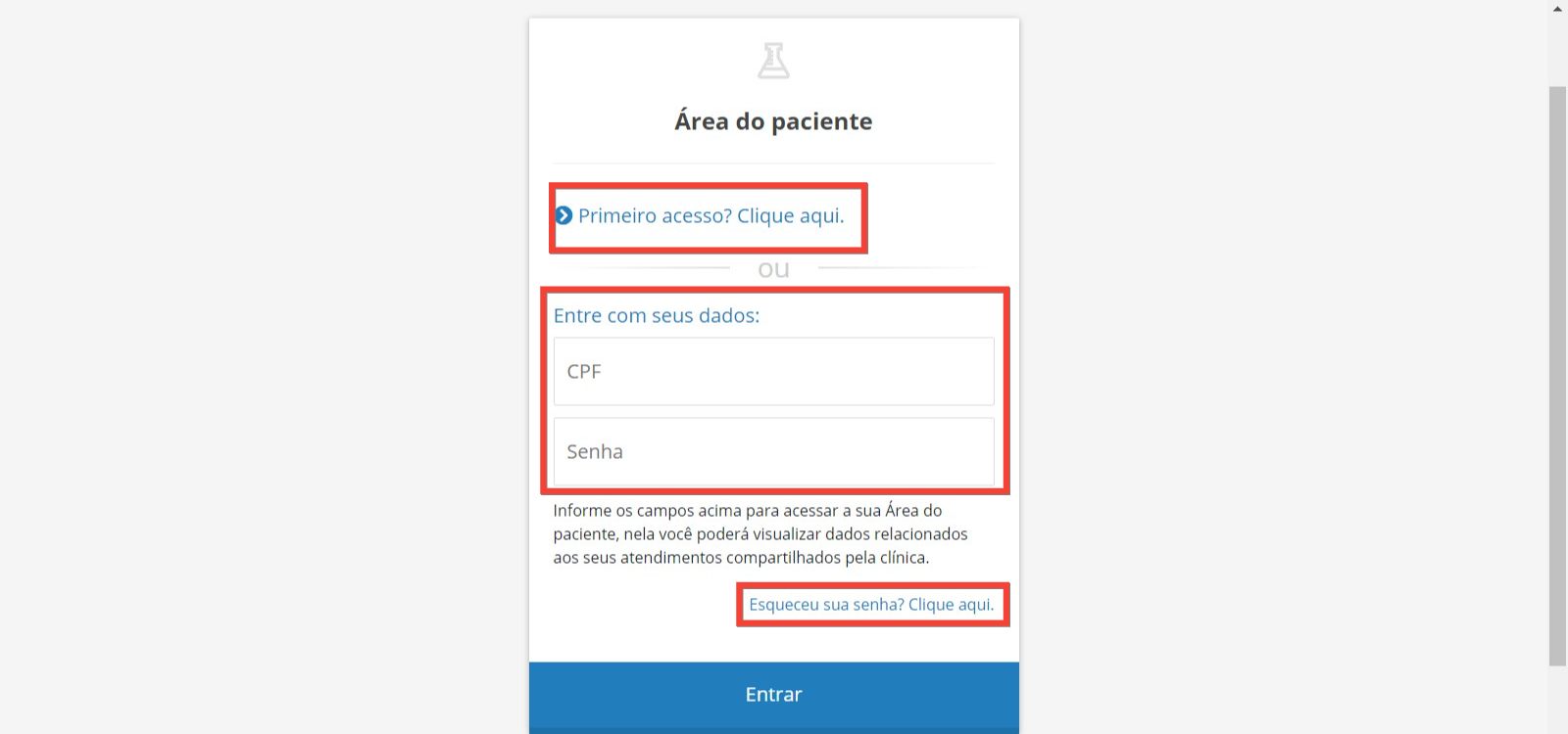 Para o primeiro acesso à área do paciente, será necessário inserir o CPF e a senha cadastrados. Portanto, é imprescindível que esses dados estejam salvos no cadastro do paciente. Além disso, é necessário ter o número de celular e/ou e-mail cadastrados para realizar o primeiro acesso ou redefinir a senha.