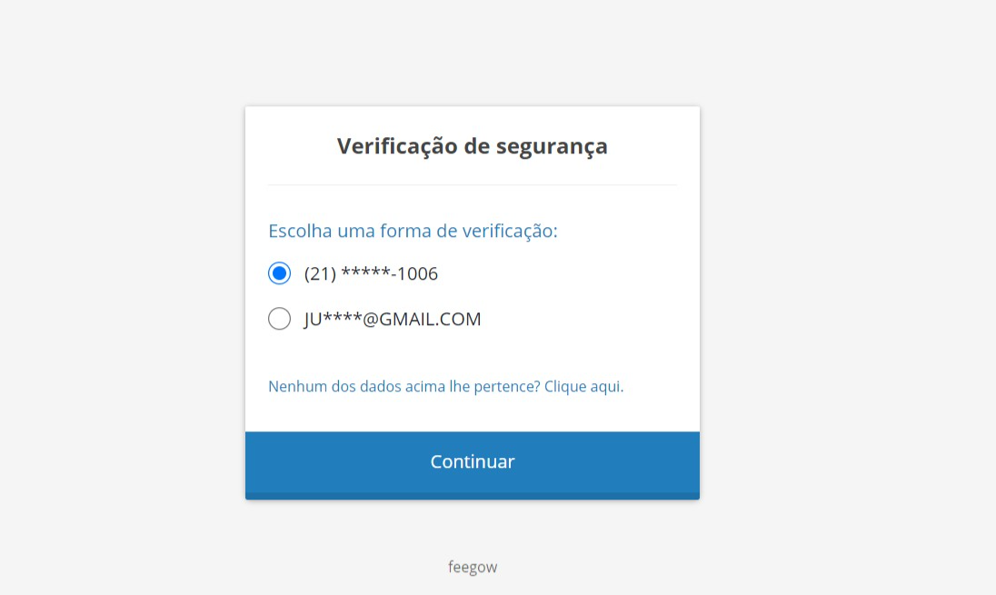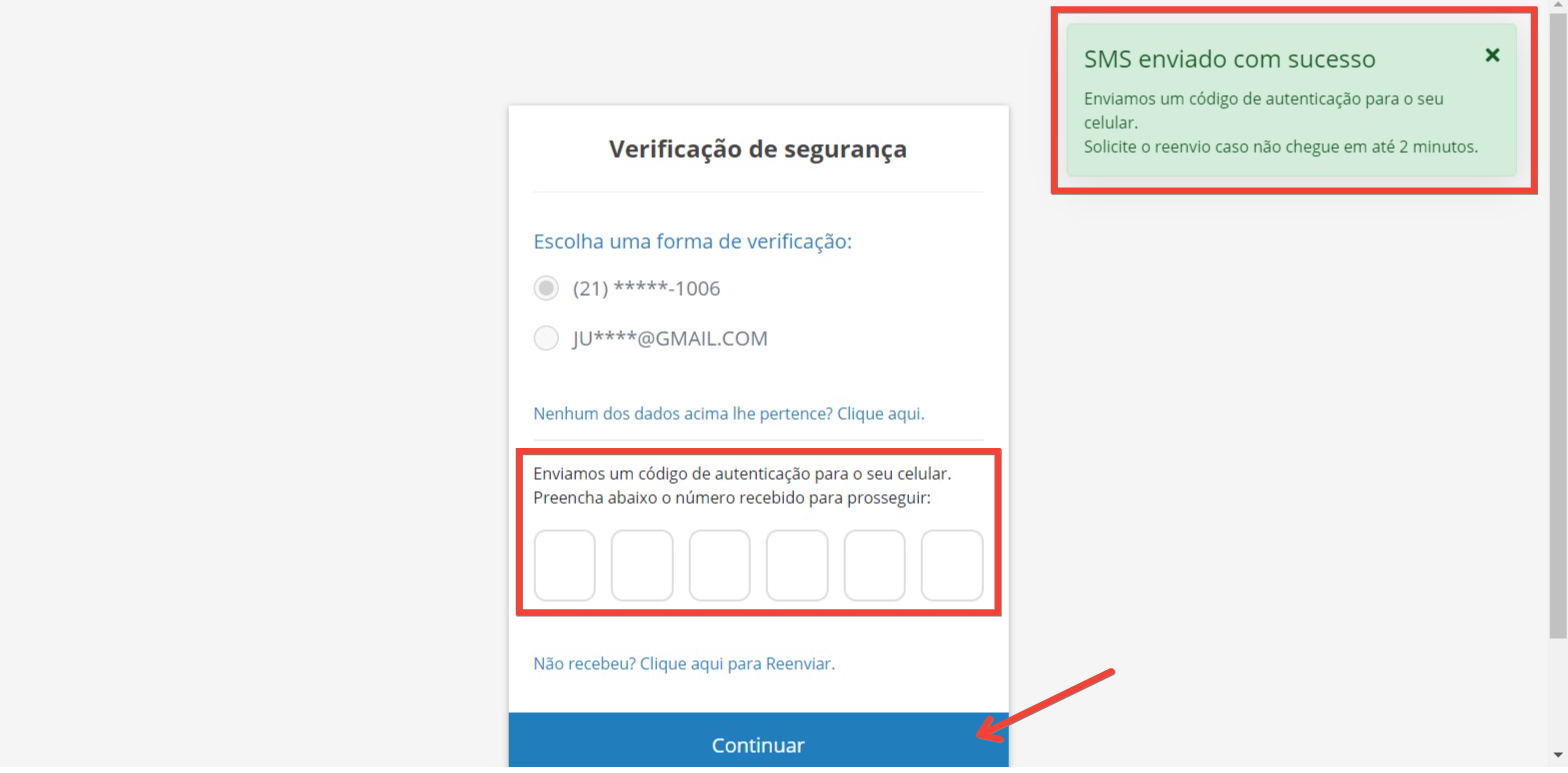 Será enviado um código de autenticação para a forma selecionada. Insira o código no campo indicado abaixo e clique em "Continuar".