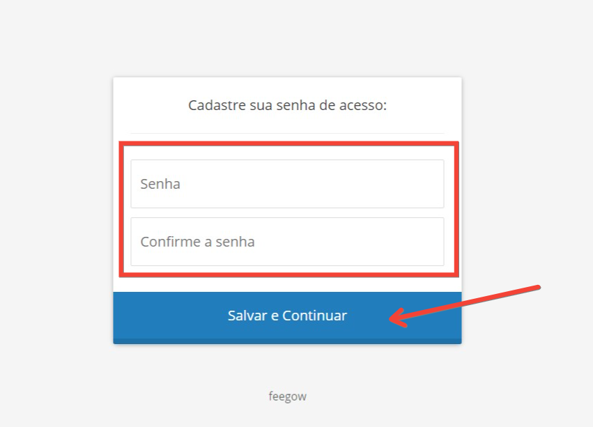 Será solicitado o cadastro de uma senha de login. Insira a senha nos campos "Senha" e "Confirmar senha". Clique em "Salvar e continuar". Após a autenticação, o paciente conseguirá acessar a Área do Paciente.