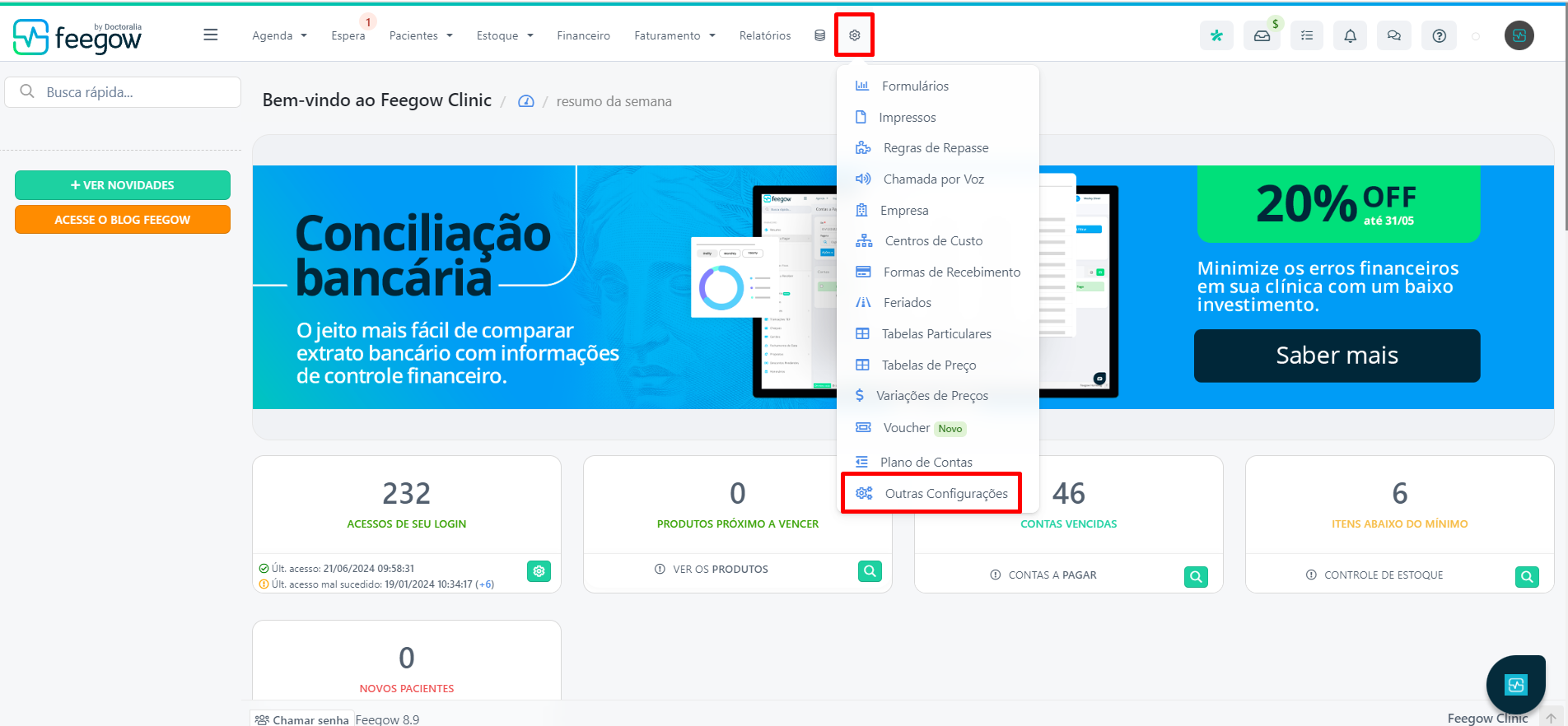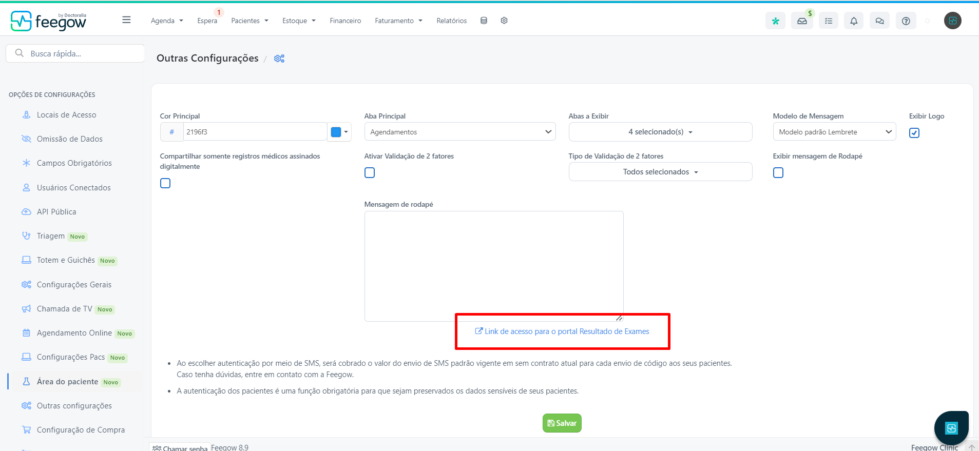 Para realizar esta configuração, vá em Configurações > Outras configurações > Área do paciente.