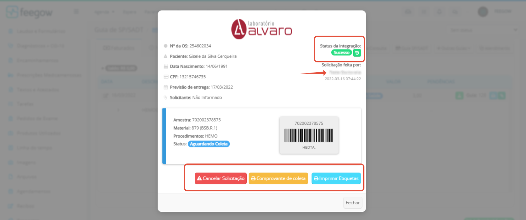 Importante: Somente será possível cancelar a integração, se for o mesmo dia em que a conta foi integrada. Se a integração não for no mesmo dia, é necessário entrar em contato com o laboratório e solicitar o cancelamento.Importante: Para cancelar um dos exames, é necessário cancelar a solicitação inteira. Se a conta estiver com valor pago, não será possível alterar a conta, mas se o valor estiver não quitado, será possível excluir/adicionar exames para então integrar novamente. Caso se trate de uma proposta, não será possível fazer essa alteração depois de ter sido gerado o contrato.- Poderá então realizar uma nova integração, selecionando o ícone da integração e indicando o laboratório/parceiro.