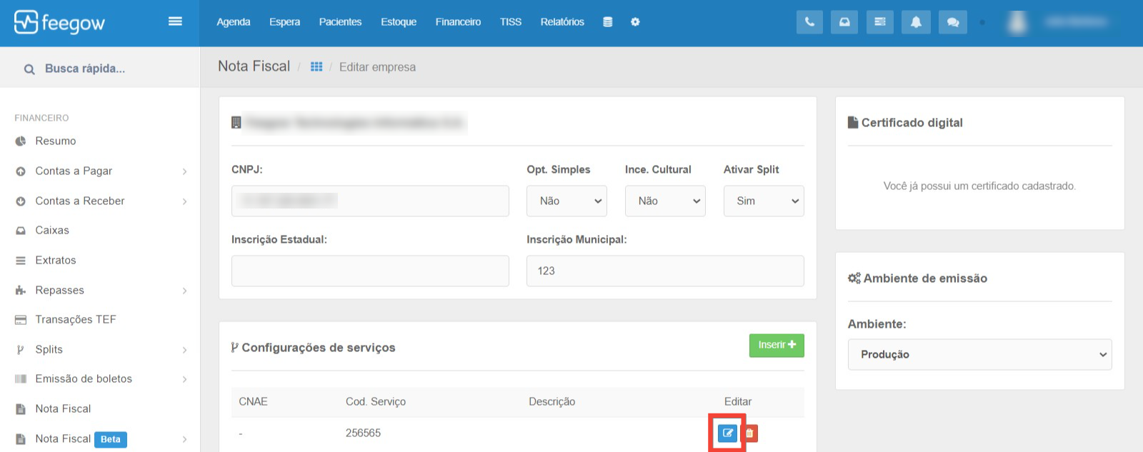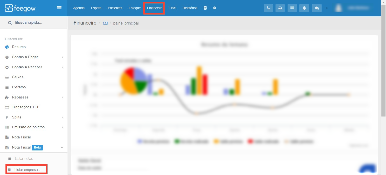 - Para solucionar este caso e conseguir gerar sua NFs, é necessário ir em Financeiro > Nota Fiscal > Listar empresas.