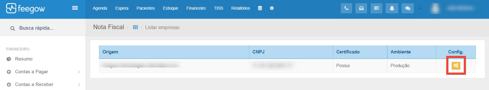 - Ao clicar em listar empresas, abrirá a página onde deve ser selecionado o ícone amarelo na coluna de configuração.