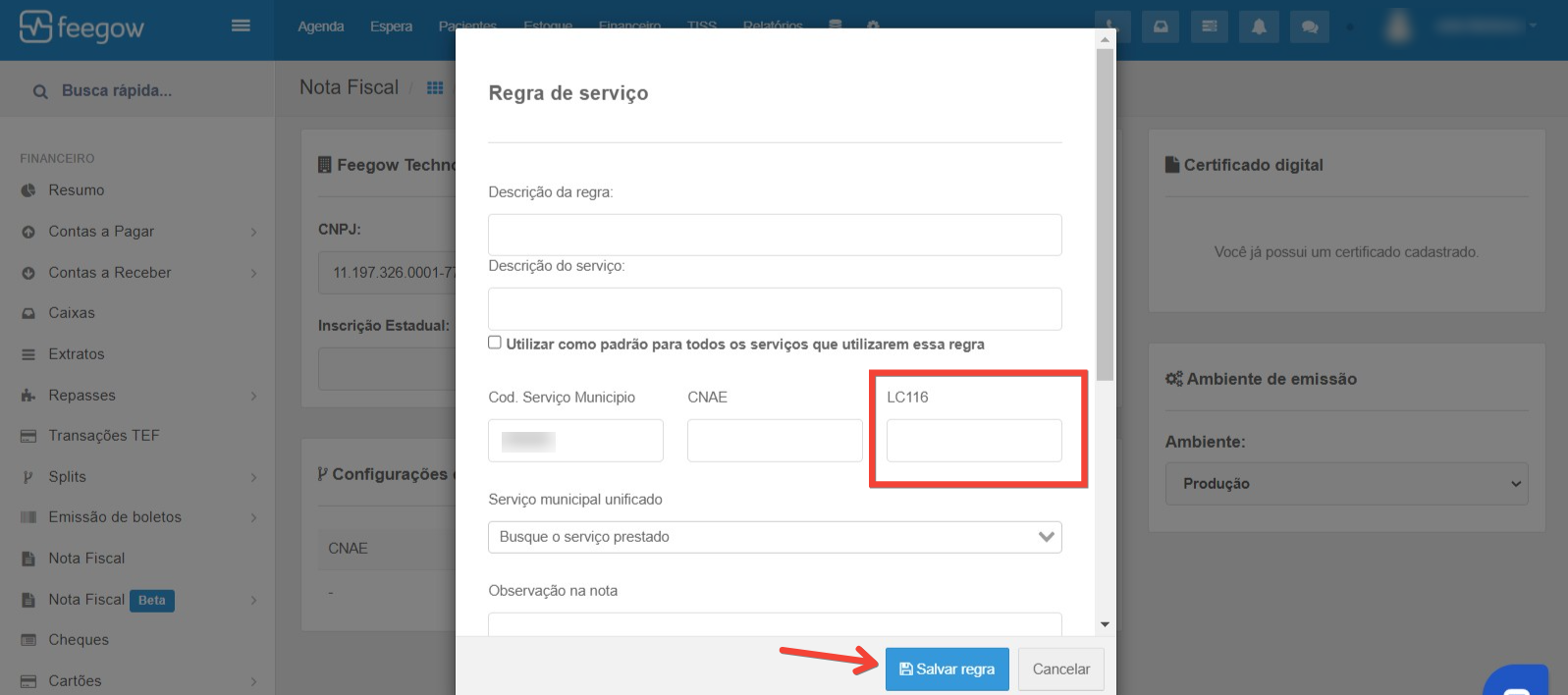 - Irá abrir o pop-up, onde deverá ser preenchido o campo de LC116.