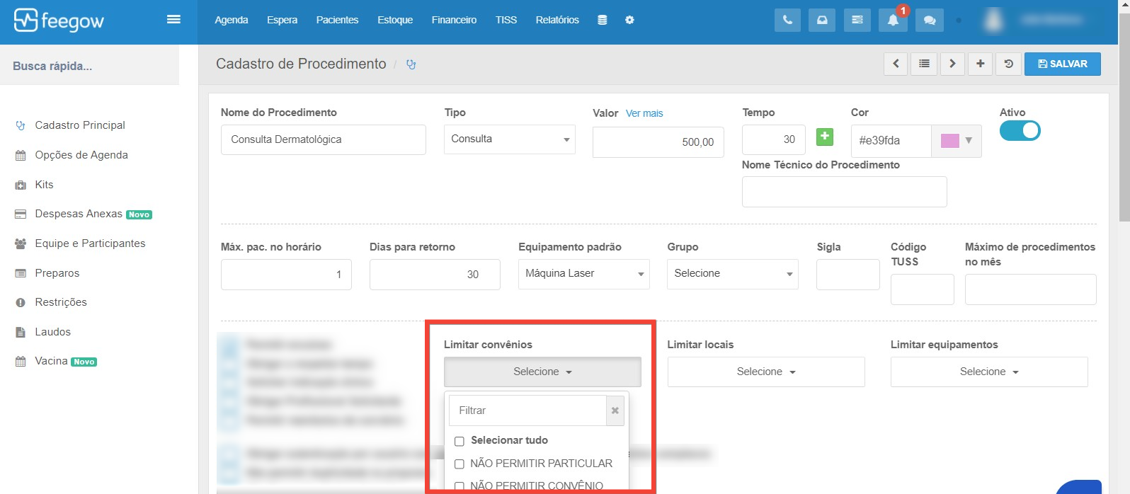 - No campo de limitar convênios, verifique se está selecionada opção de não permitir convênio ou se está limitado os convênios aceitos.