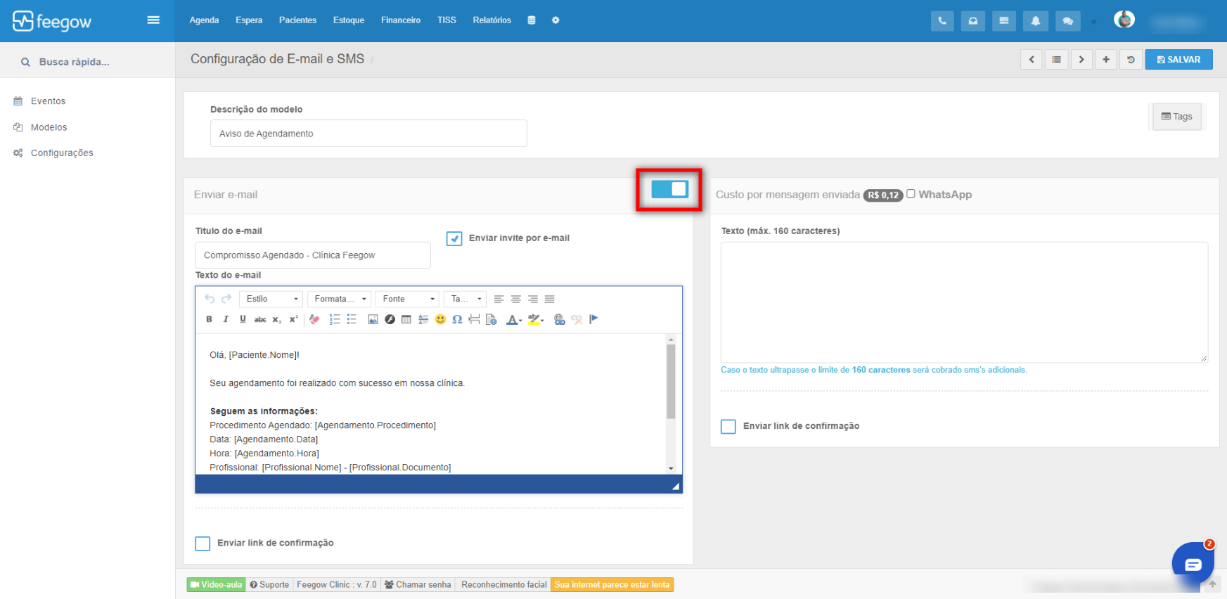 - Modelo de mensagem: Selecione o modelo configurado para o aviso de Agendamento Realizado.