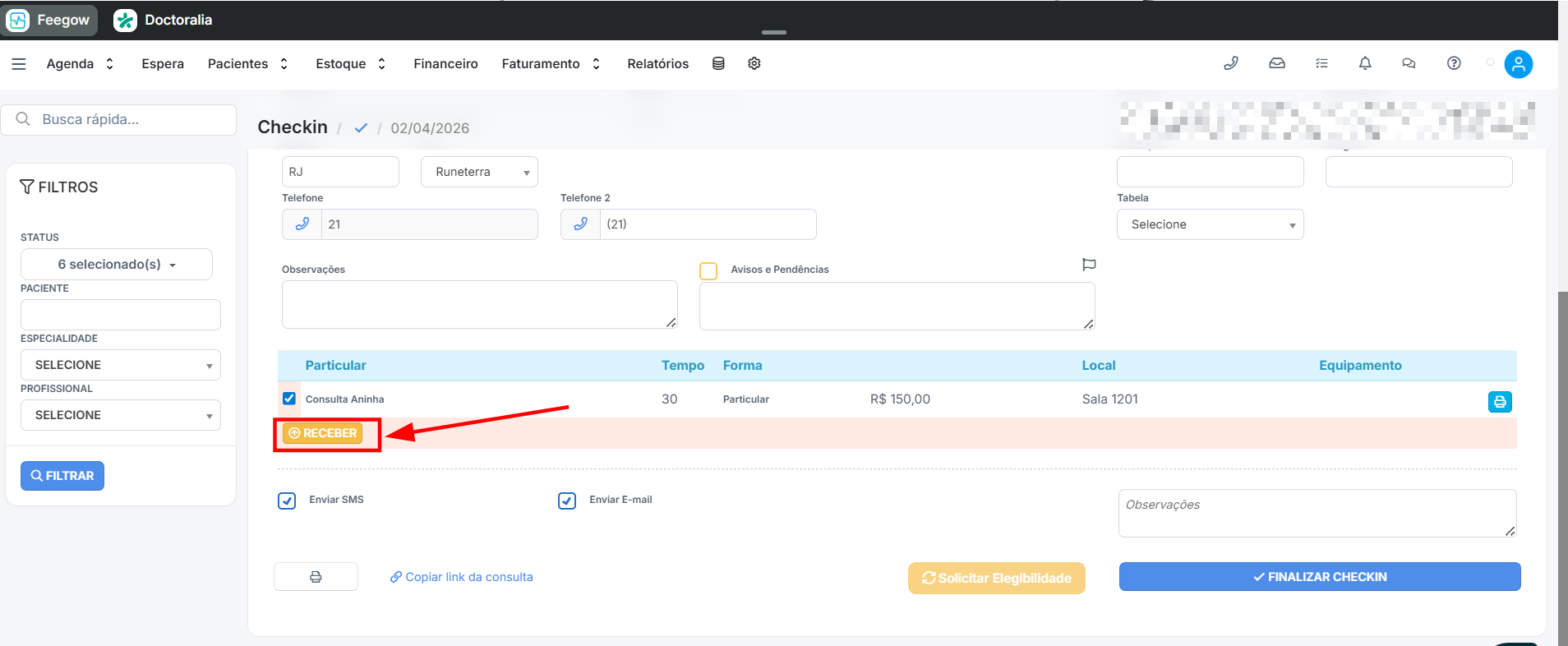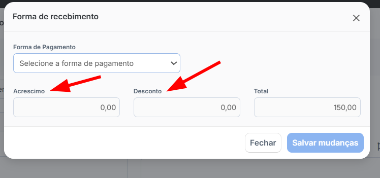 - Feito isso, o usuário quando for realizar o check-in de qualquer paciente, e clicar em receber, abrirá o pop-up para indicar a forma de recebimento e se serão concedidos descontos ou acréscimos.