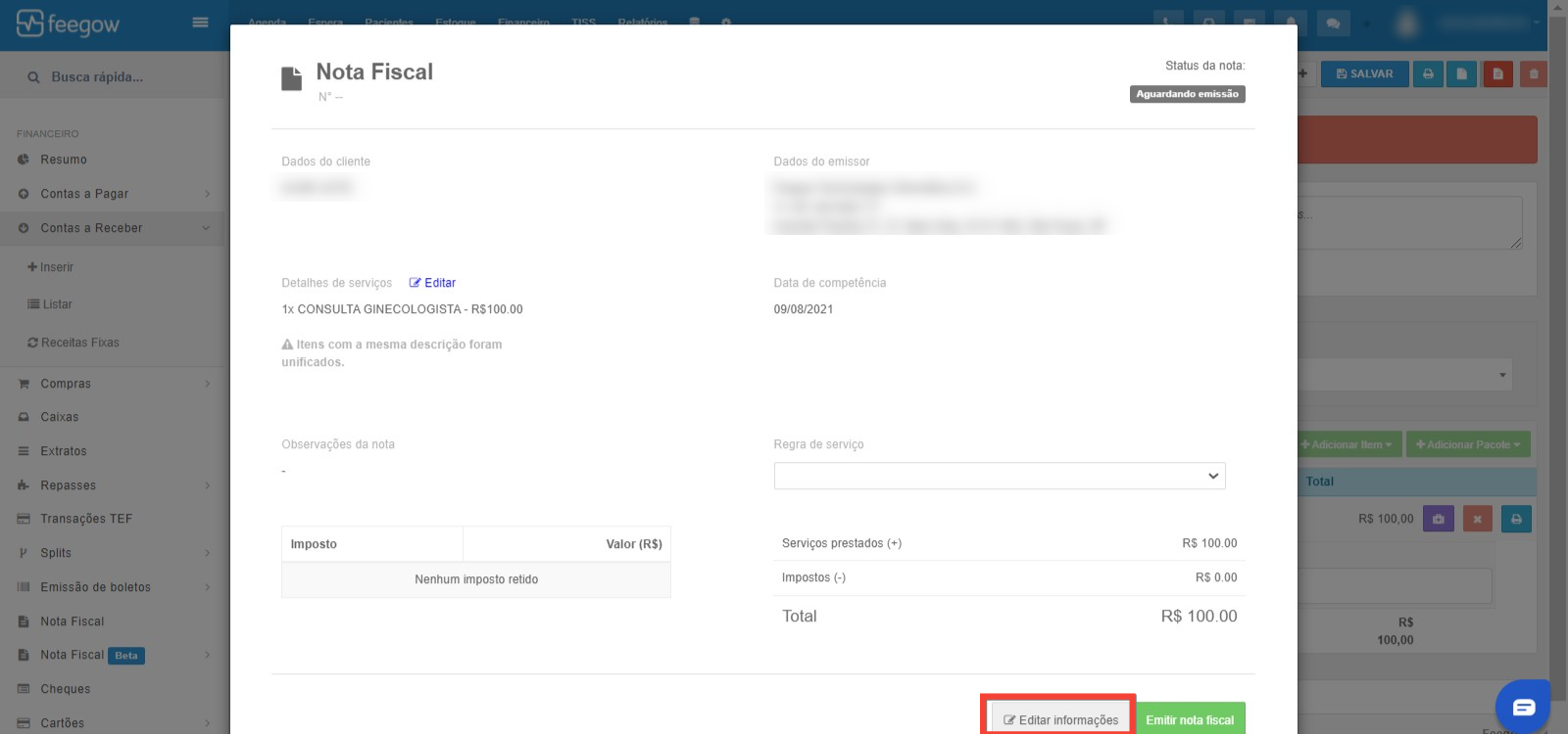 • Preencha conforme deseja e clique em emitir Nota Fiscal.