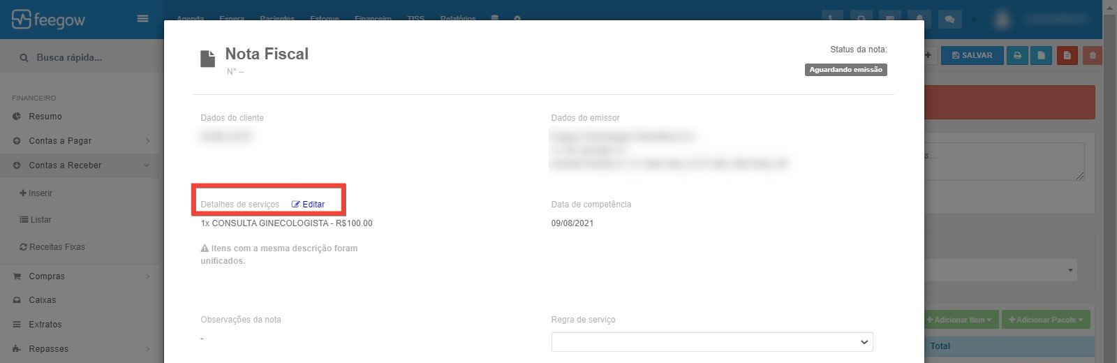 • Caso precise editar a descrição da Nota Fiscal, será necessário clicar em editar.