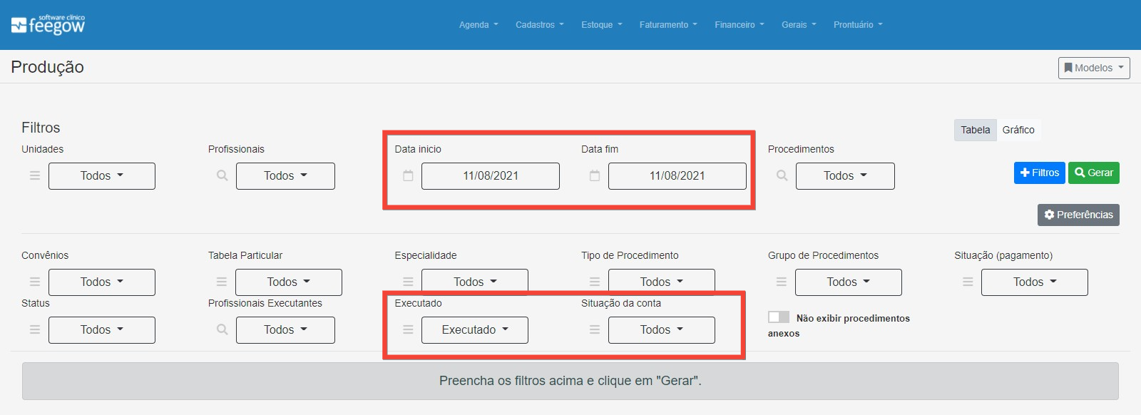 - Dois filtros importantes neste filtro, é o de executado e situação na conta. Selecionando eles e indicando se deseja visualizar somente os procedimentos executados e na situação da conta, somente as quitadas ou parcialmente pagas, trará como resultado tudo o que foi realizado e recebido na clínica.