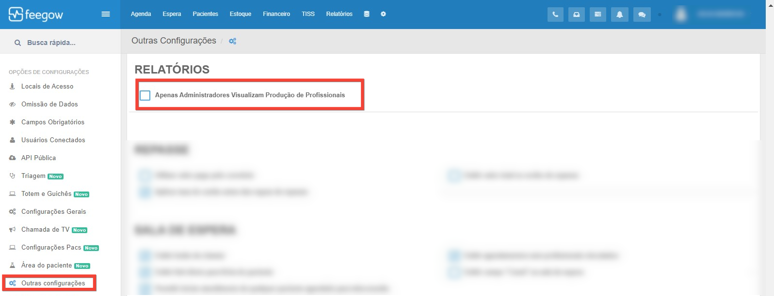 - Em Relatórios, precisará desmarcar a configuração "apenas administradores visualizam produção de profissionais".