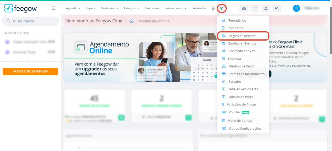- O usuário deverá ir em Configurações > Regras de Repasse.