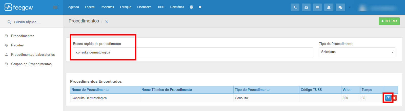 - Busque pelo procedimento desejado, e clique para editá-lo.