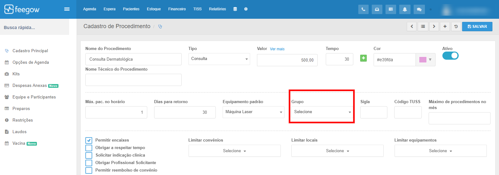 - Ao abrir o cadastro do procedimento, é necessário selecionar então o grupo do mesmo.