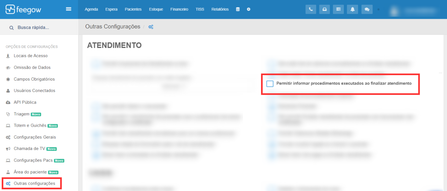 - Em Atendimento, habilite/desabilite a configuração "permitir informar procedimentos executados ao finalizar o atendimento".