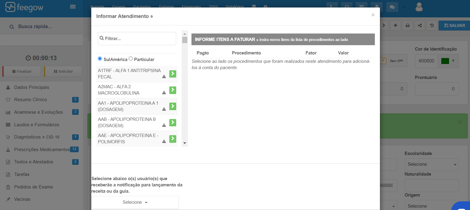 - Dessa forma, ao habilitar a configuração, aparecerá o pop-up para seleção de procedimentos ao finalizar o atendimento e caso desabilite a configuração, não irá aparecer.