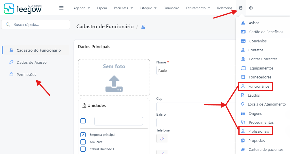 Para habilitar esta permissão, é necessário que o usuário master entre no cadastro do usuário profissional ou funcionário, em que deseja realizar a alteração e vá em Permissões.