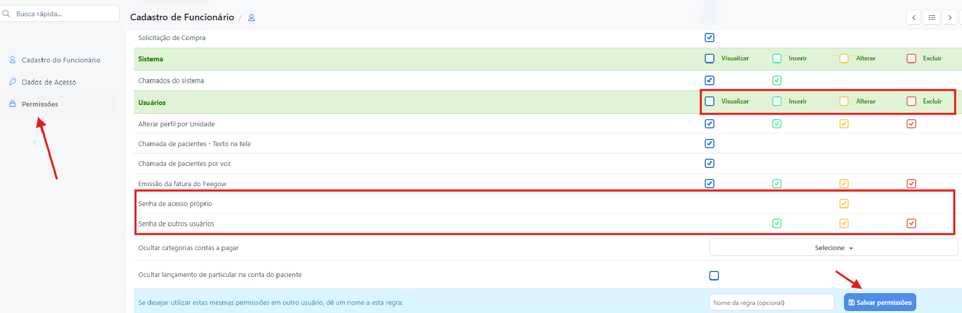 No tópico de "Usuários" deverá selecionada as opções nas permissões de "senha de acesso próprio e "senha de outros usuários" conforme o desejado e clique em Salvar Permissões