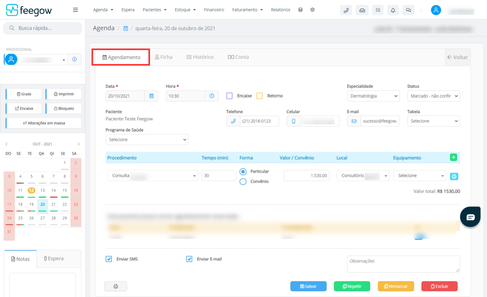 - É nesta tela que o usuário poderá Remarcar, Repetir ou Excluir o agendamento.