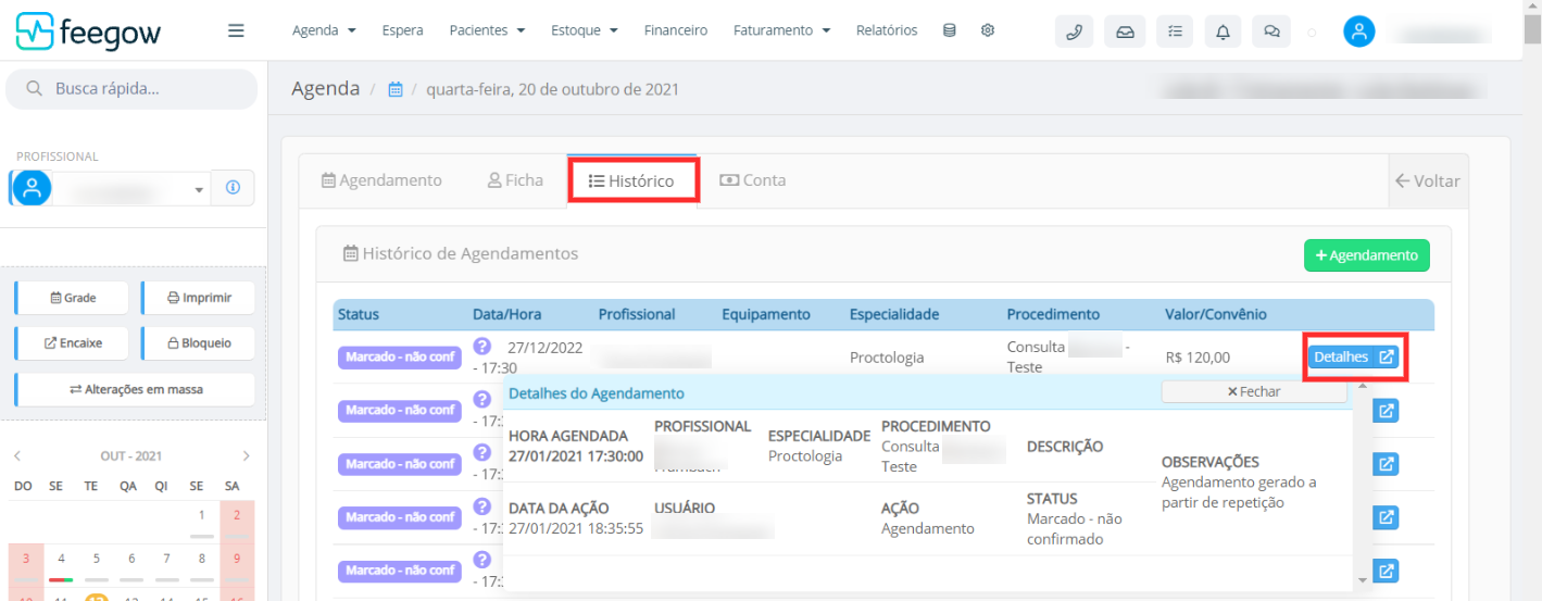 - Nesta opção poderá também ser verificada informações detalhadas dos agendamentos, como usuário que realizou determinada ação e data e hora, selecionando a opção de Detalhes.