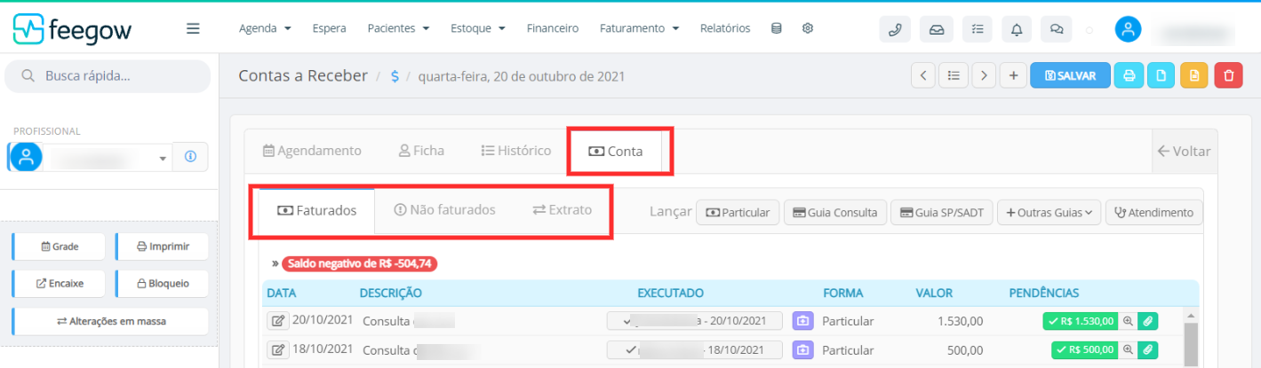 - A aba de conta, é onde constará as movimentações financeiras do paciente.