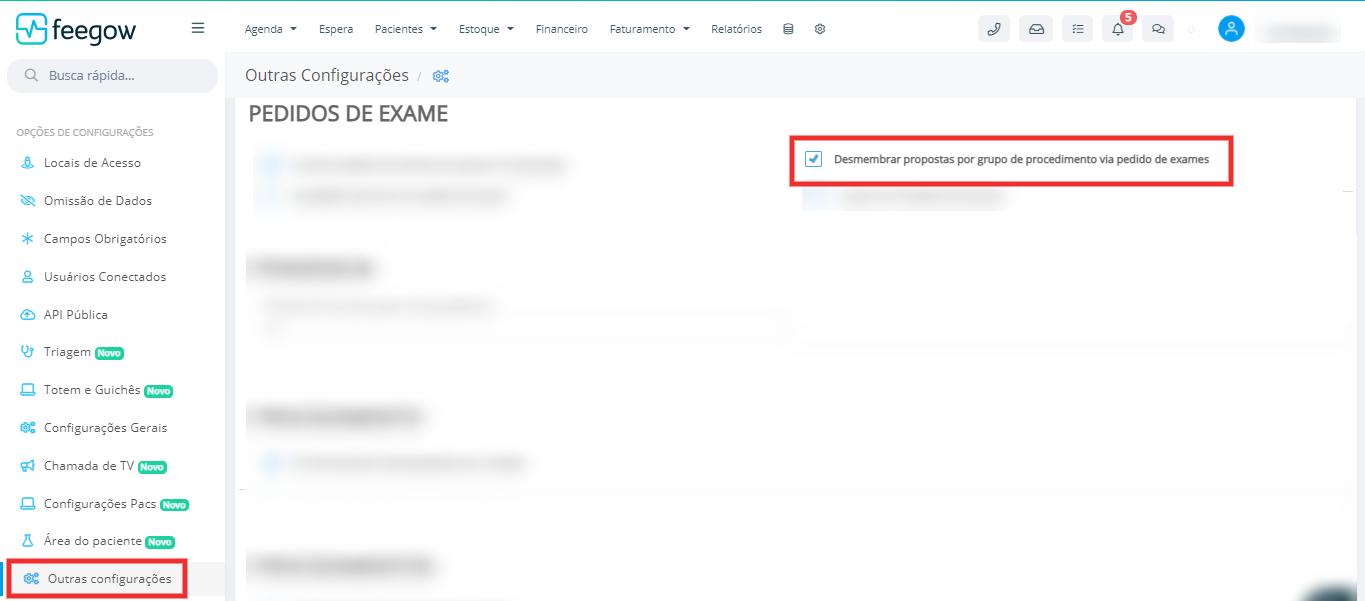 - Busque pelas configurações de Pedidos de Exame, e habilite/desabilite a configuração de "Desmembrar propostas por grupo de procedimento via pedido de exames ".