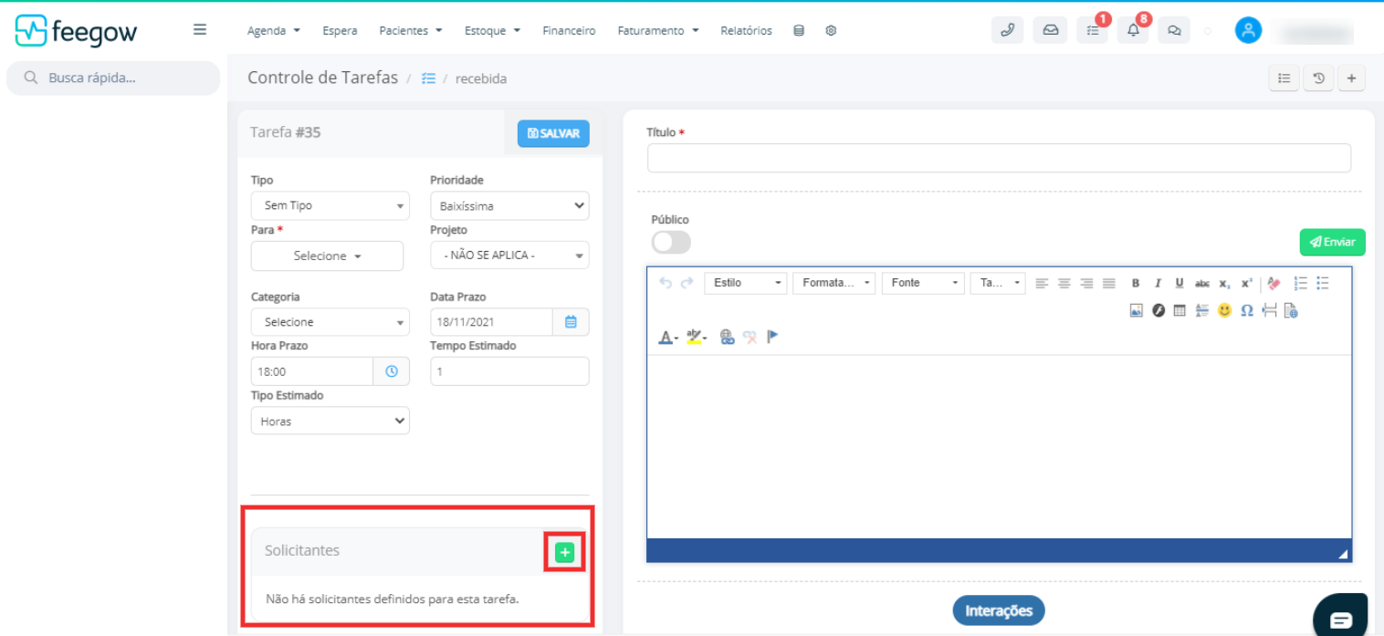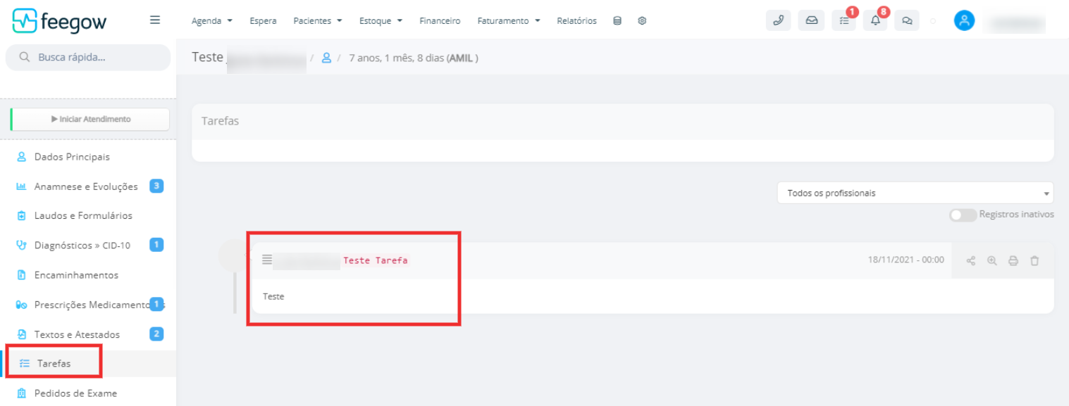 - Para que conste uma Tarefa, no prontuário do paciente, é necessário que ao inserir a Tarefa, o usuário indique o paciente como "Solicitante".