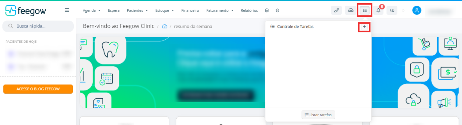 - O usuário precisará selecionar o ícone de Tarefas, no menu superior.