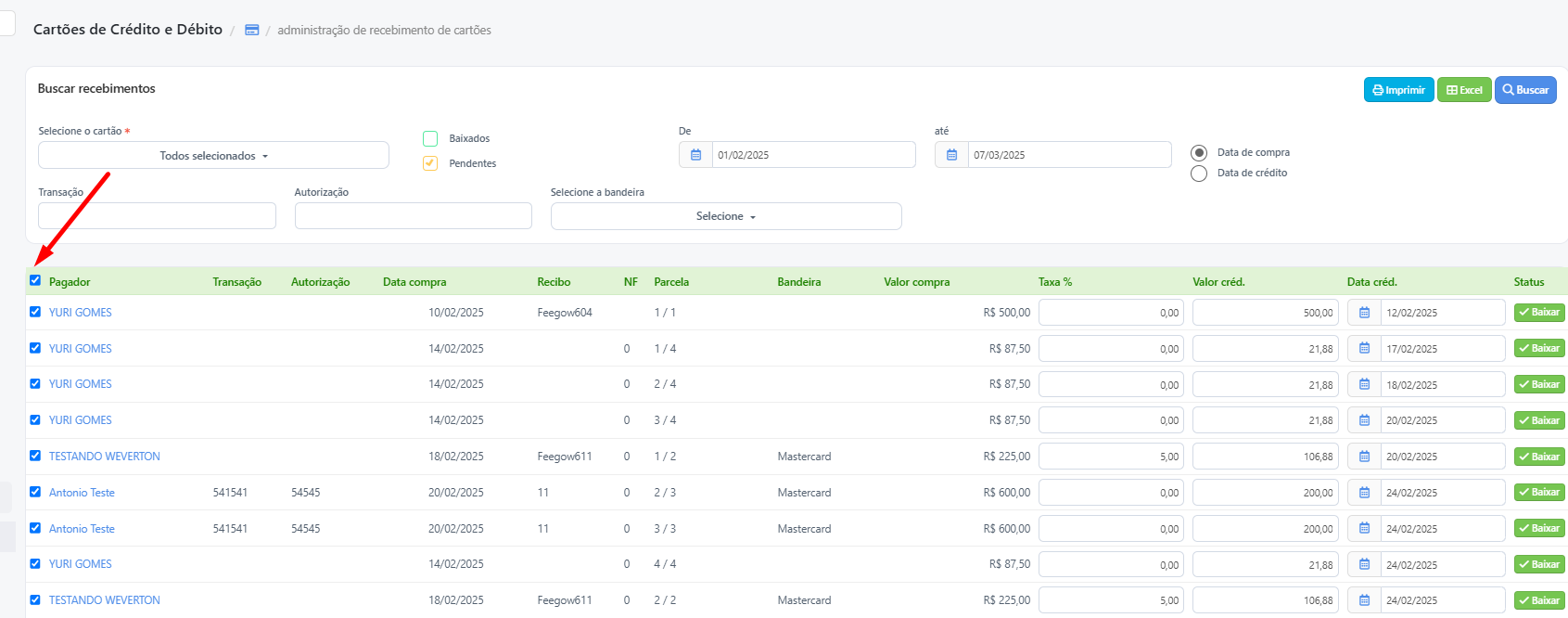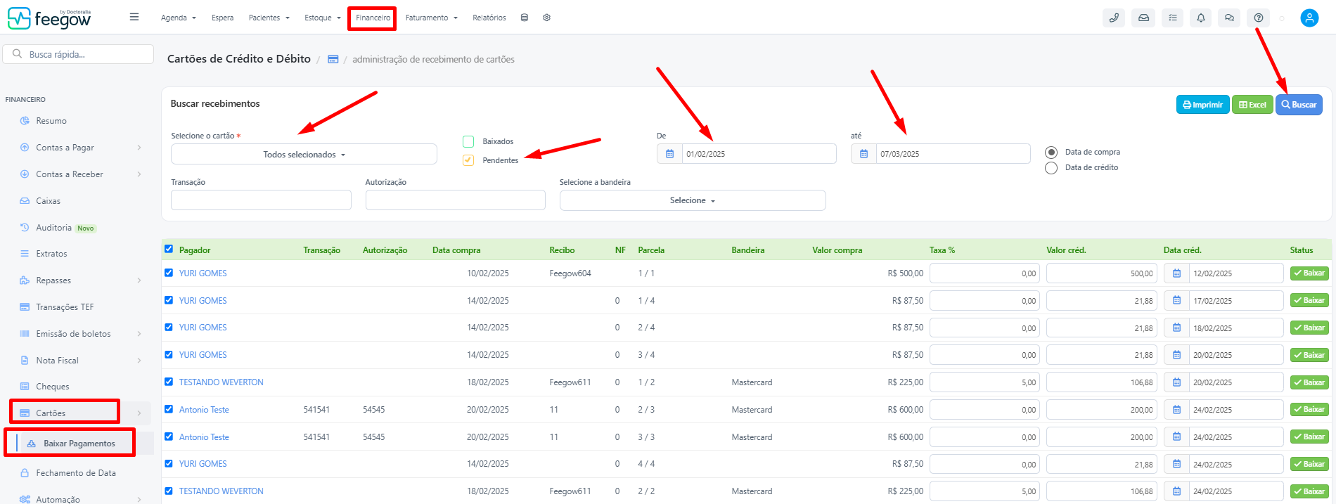 Vá em Financeiro > Cartões > Baixa de cartão > Selecione o período pretendido e os cartões e clique em Buscar.