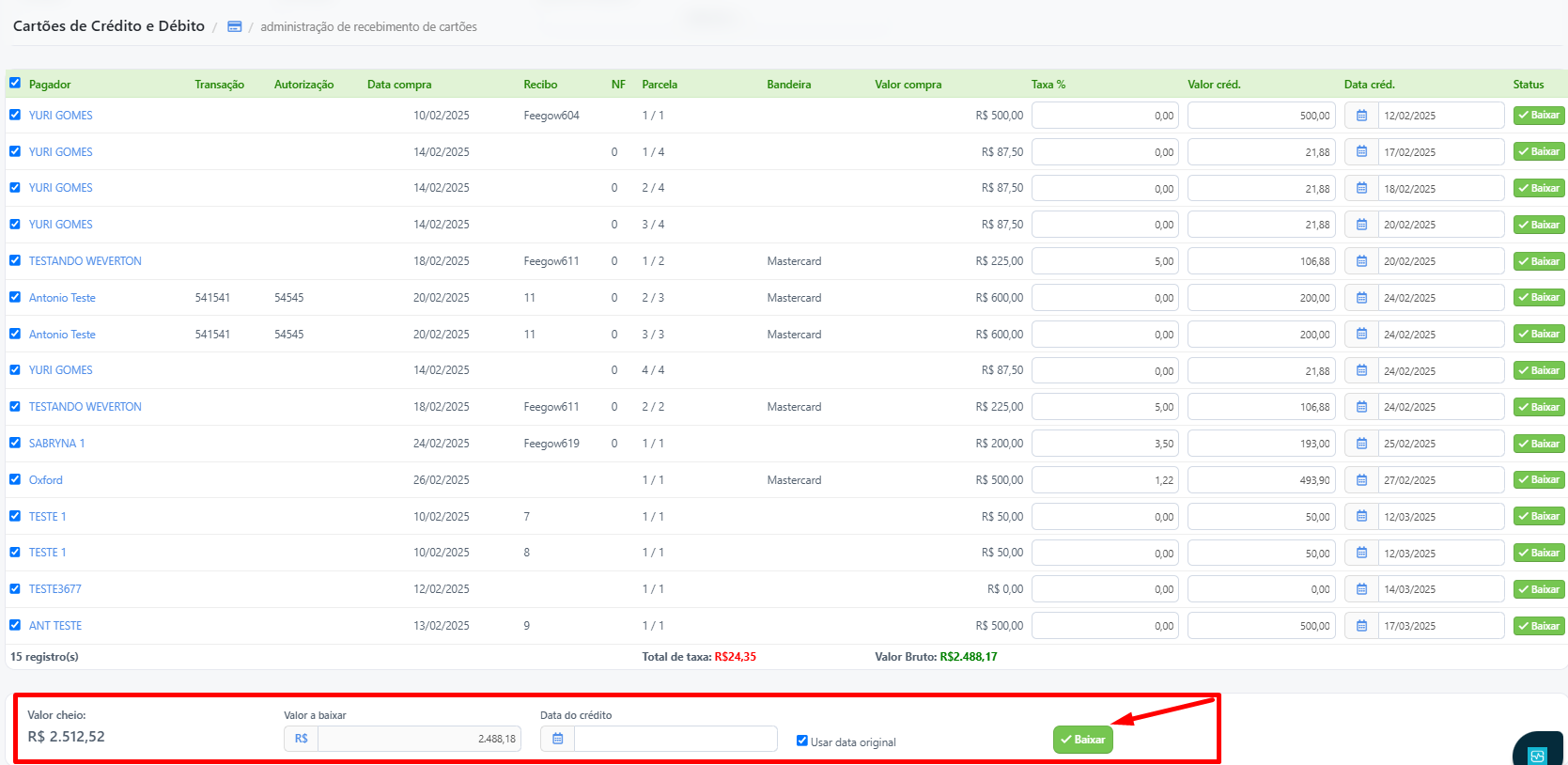 Nesse artigo vamos aprender que é possível dar baixa de cartão em lote. No dia a dia das clinicas pode ser muito complicado ter que baixar um a um. Se você já registrou todas as taxas corretamente lá em Contas Correntes, basta fazer a baixa em lote para adiantar a sua demanda diária. Se ainda não cadastrou as taxas, não deixe de consultar nosso artigo sobre Contas Correntes.