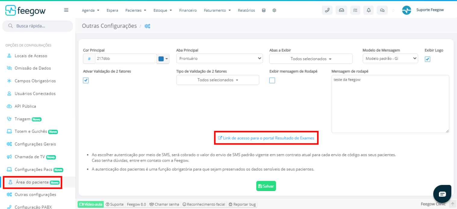 O usuário sendo ADMIN conseguirá identificar o código da licença pelo link da Área do Paciente, indo em Configurações > Outras Configurações > Área do Paciente, clique na opção "Link de acesso para o portal Resultado de Exames", com isso abrirá o link: