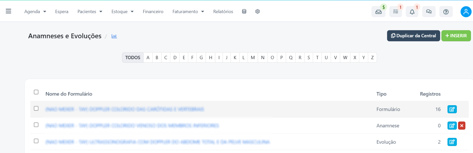 Os tipos de formulários disponíveis são: Anamnese, Evolução e Formulário.