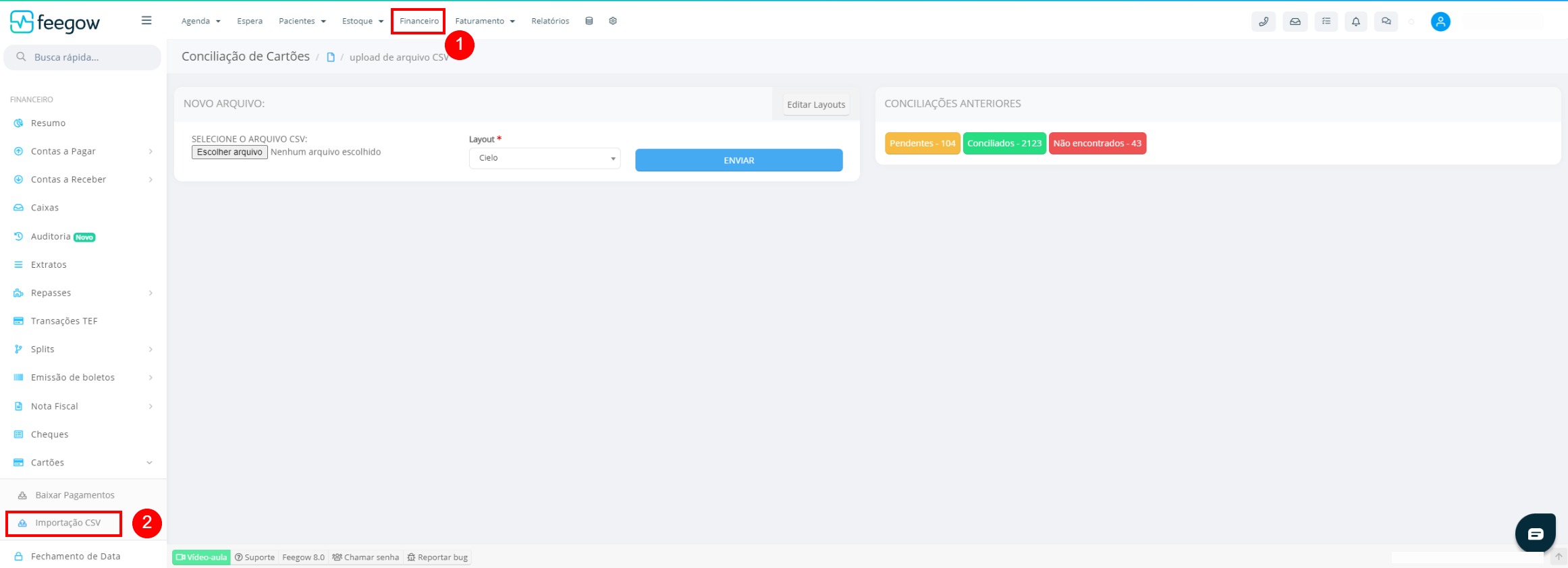 Para editar um modelo de CSV dentro do Feegow, é necessário ir em "Financeiro > Cartões > Importação CSV".