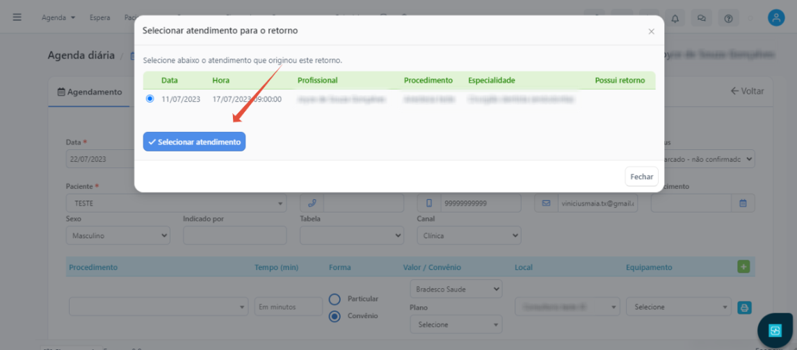 Feito isso, irá aparecer o pop-up para selecionar o atendimento de retorno, nessa tela, serão listados todos os agendamentos que estão como 'atendido' para determinada Profissional e que ainda não teve geração de retorno para eles.