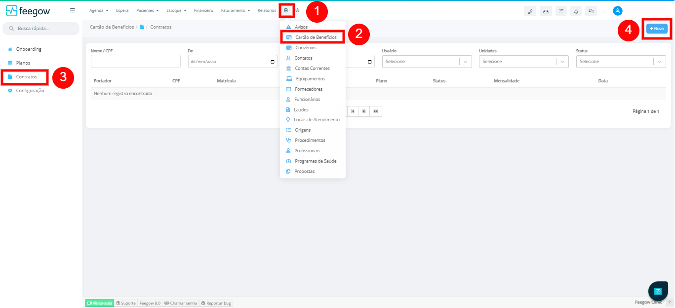 - Para acessar a área de Contratos do Cartão de Benefícios é necessário ir em: Cadastros > Cartão de Benefícios > Contratos;